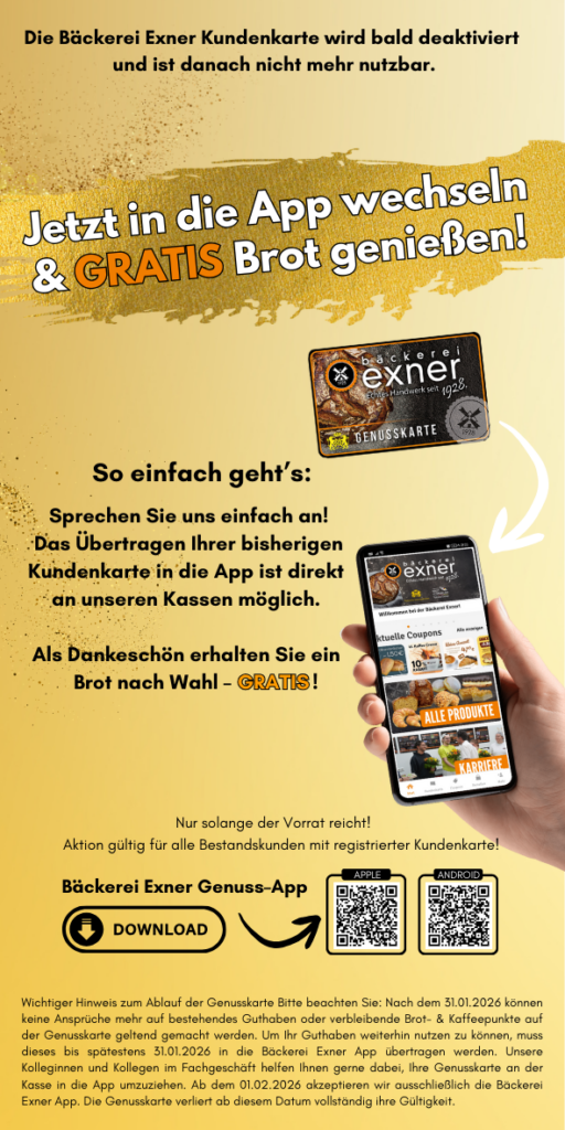 Bis einschließlich 31.01.2026 haben Sie die Möglichkeit, Ihr bestehendes Guthaben von der Genusskarte direkt an der Kasse in unseren Fachgeschäften in die Bäckerei Exner App zu übertragen.